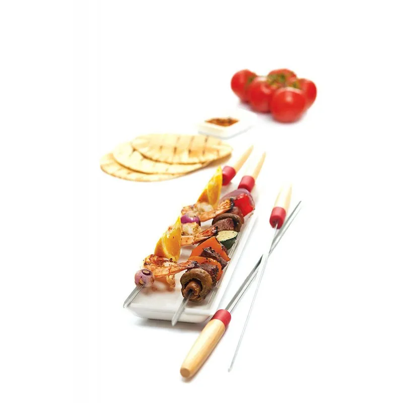 Набор из 6 шампуров из нержавеющей стали имеют деревянные ручки и силиконовые ободки. Силиконовая рамка помогает ручке оставаться холодной дольше на гриле! Отлично подходят для мяса, овощей и закусок.