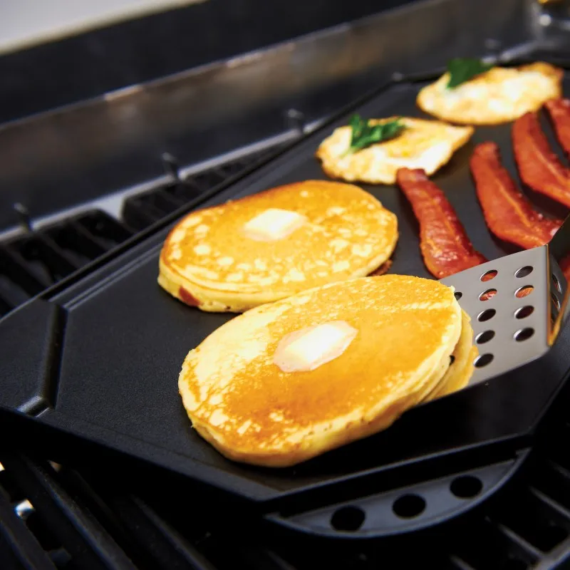 Двухсторонний противень из литого алюминия с антипригарным покрытием. Плоская сторону можно использовать как сковородку и жарить яйца, блинчики, бекон. А на гриль стороне жарить рыбу, морепродукты, овощи гриль.