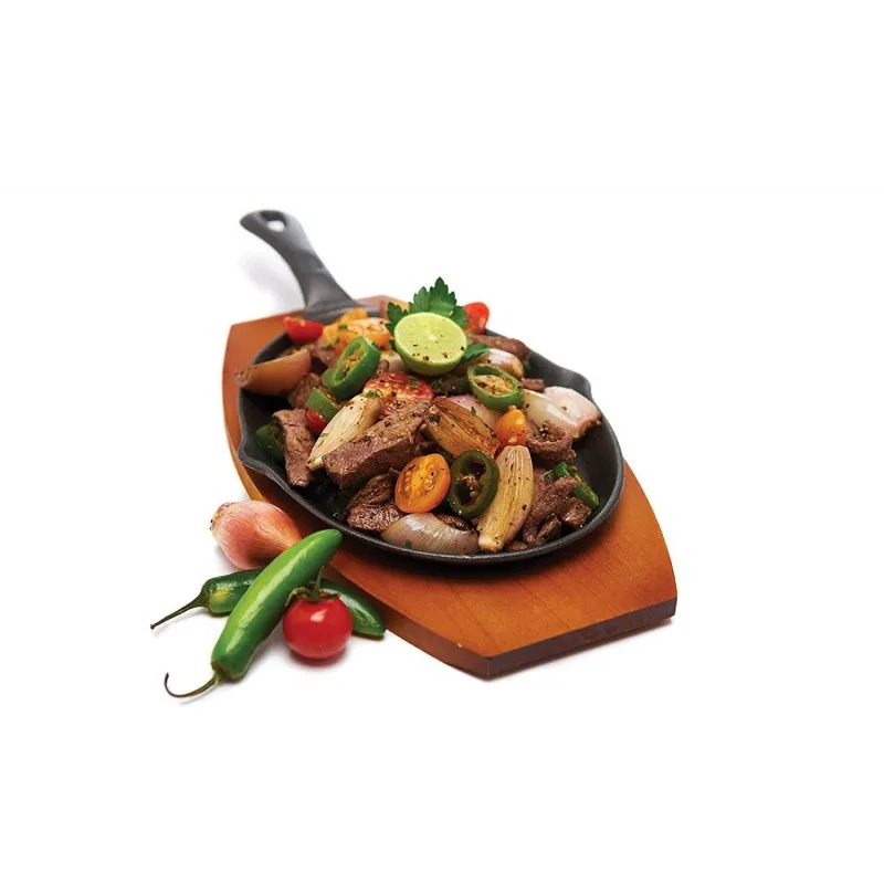 Тяжёлая чугунная сковородка незаменима во время приготовления фахитас, мяса и овощей. В набор входит деревянная подставка под сковородку и хлопковая прихватка.
