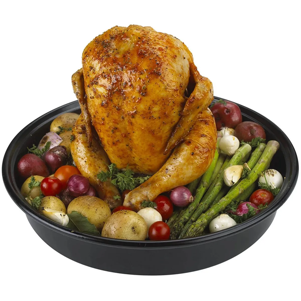 Стойка имеет стандартную круглую форму, высокие бортики и двойное дно. Внутри спрятана емкость, куда можно налить воду. В процессе жарки на гриле жидкость выпарится, а вы легко сможете вытащить стойку с содержимым, и поставить ее на стол в качестве основного блюда.