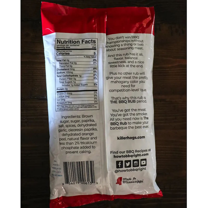 Команда Killer Hogs Championship BBQ Team — один из лучших производителей специй и соусов для барбекю. Специи созвались 13 лет и наконец были доведены до совершенства! BBQ Rub — это особая сбалансированная смесь органических сахаров, соли, дымного перца и других специй, которая раскрывает лучшее во всем, что вы готовите, подчеркивая натуральный вкус мяса, не подавляя его. Это фаворит во многих магазинах барбекю в Штатах. Ингредиенты: коричневый сахар, сахар, соль, перец, специи, включая перец чили, сгущенный тростниковый сок, обезвоженный чеснок и цедра апельсина, луковый порошок, глутамат натрия, горчичная мука, экстракты паприки (цвет), травы укропа, куркумы (цвет ), натуральный ароматизатор.