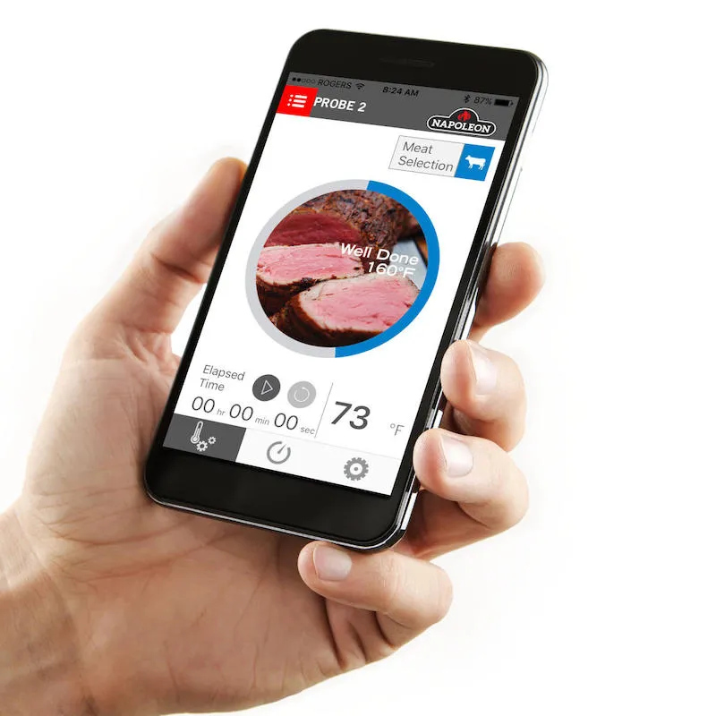 Канадская компания «Napoleon», производитель угольных и газовых грилей, создала кулинарный термометр с блютуз, который позволит вам контролировать внутреннюю температуру блюда на протяжении всего процесса приготовления. Благодаря щупам из нержавеющей стали. Блютуз термометр для мяса способен контролировать до 4 точек блюда (в комплекте производитель предоставляет 2 щупа) и способен работать в диапазоне температур от -20 до +300 C. Кроме того, оснащен магнитным держателем для установки прибора на гриль-станцию. Используя щуп, вам совсем не обязательно находиться возле гриля. Умная машина предупредит вас о степени готовности блюда, отправив сообщение на смартфон.