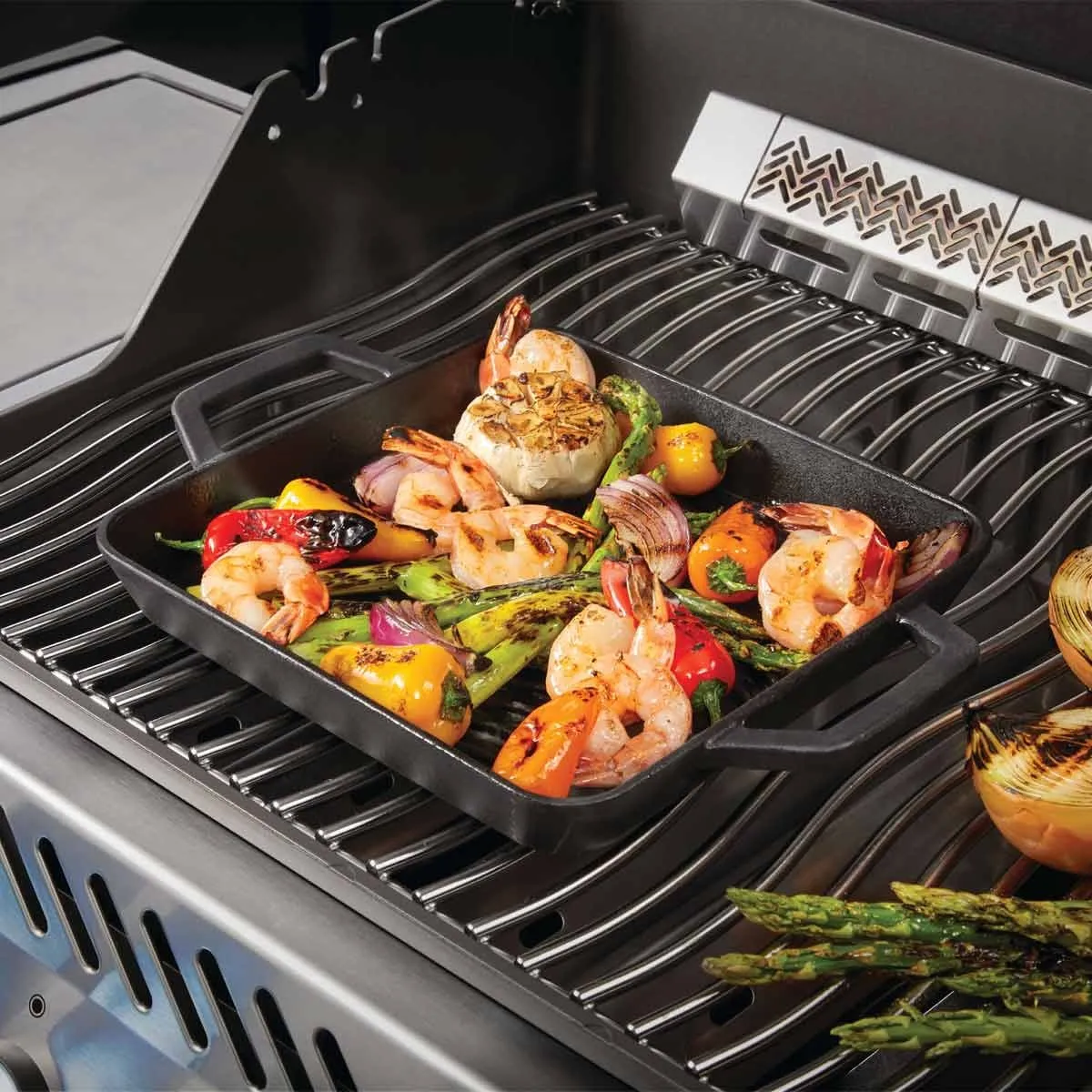 Квадратная чугунная сковорода Napoleon — идеальный помощник для приготовления хрустящего обжаренного мяса и овощей. Благодаря прочному чугуну сковорода равномерно сохраняет и распределяет тепло, обеспечивая интенсивное подрумянивание и наилучший вкус, включая популярные полоски гриля Napoleon WAVE. Поверхность с фарфоровым покрытием не только обеспечивает долговечное антипригарное покрытие, но и особенно проста в уходе — ее легко чистить после приготовления на гриле. Благодаря удобным ручкам с обеих сторон сковороду легко перемещать и безопасно держать в руке. Эта универсальная сковорода-гриль многофункциональна и может использоваться на боковых горелках гриля, в инфракрасной зоне, непосредственно на решетке гриля или даже на кухонной плите. Идеально подходит для любителей барбекю, которые ценят высококачественные материалы и простоту в обращении!