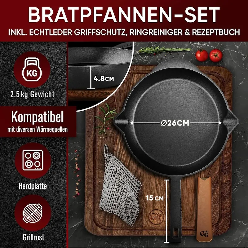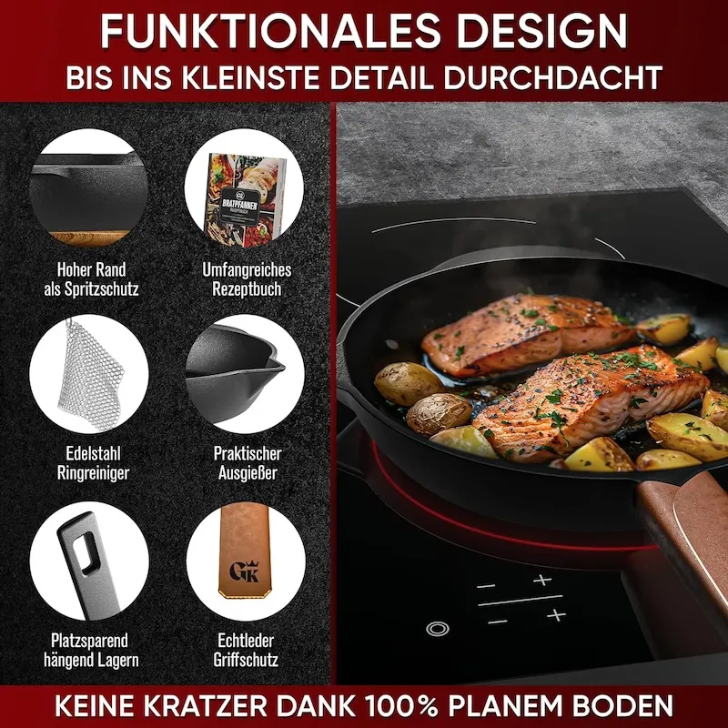 Чугунная сковорода Gusskönig выдерживает температуры до 300°C без деформации, что делает ее надежной для любых кулинарных вызовов.