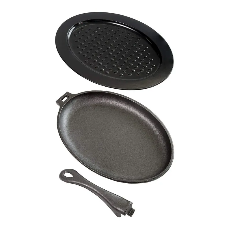 Чугунная неглубокая сковорода Napoleon, идеальная для всех, кто впервые решил готовить не на железном покрытии. Данную сковороду нужно использовать непосредственно на жарочной решетке гриля, на боковой горелке или даже в печи. Съемная ручка остается охлажденной во время приготовления пищи, благодаря легкому захвату и разъединению для быстрого перемещения и снятия пищи на сковороде. Сковороду Napoleon, просто мыть, нанесите тонкий слой растопленного жира или масла и выпекайте в предварительно разогретом гриле при температуре 175°C в течение часа. Это гарантирует что антипригарное покрытие, которое имеет данная сковорода, будет служить долгие годы, которое так необходимо для приготовления блюд на гриле. Снимите с помощью ручки шипящее блюдо прямо с гриля и подайте на стол установив сковороду на термостойкую подставку.