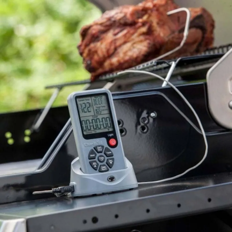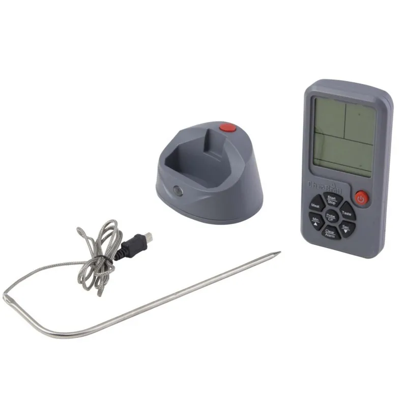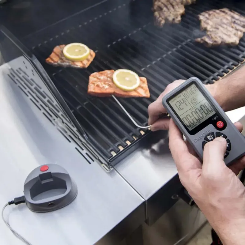 Беспроводной термометр для измерения температуры блюд и определения степени их готовности. Комплектуется подставкой и длинным щупом из нержавеющей стали, который одновременно анализирует температуру из пяти точек. Точные данные о температуре отображаются на большом цифровом дисплее. В термометр заложено пятнадцать программ приготовления и возможность выбора пяти видов мяса. Термометр легок в использовании. Подсветка дисплея позволит комфортно готовить даже ночью. Подходит для использования с любым типом гриля.