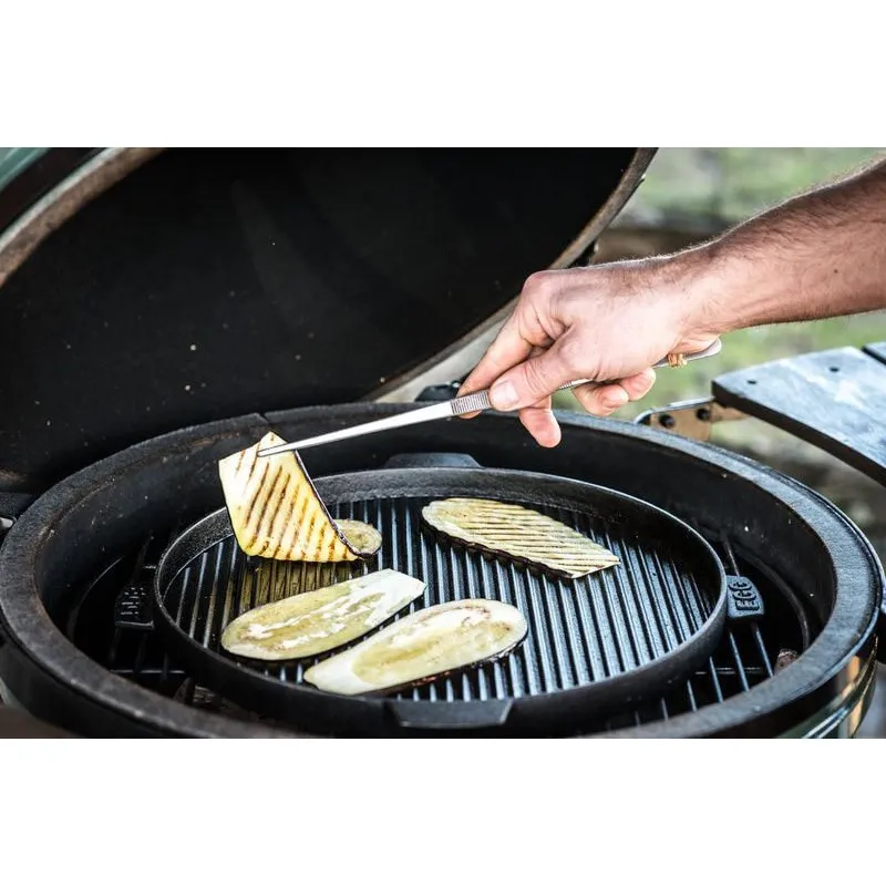 Иногда сталкиваетесь с тем, что некоторые ингредиенты не держатся на решетке Big Green Egg? В таком случае мы предлагаем вам обратить внимание на чугунную сковороду. Её гладкая поверхность идеально подходит для приготовления блинчиков или яичницы, а на рифленой поверхности отлично получаются небольшие изысканные блюда.