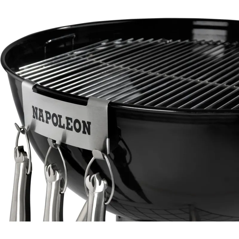У угольных грилей есть один существенный недостаток – ввиду малых габаритов, у них недостаточно места для хранения инструментов для готовки. Поэтому такая вещь, как держатель для приборов понравится не только новичкам, но и профи гриллинга. Держатель приборов Наполеон легко крепится и позволяет зафиксировать три нужных инструмента для готовки. Достаточно просто повесить фиксатор с внешней стороны гриля – и он становится пригодным к применению.