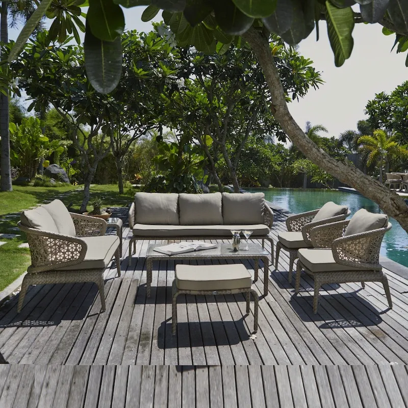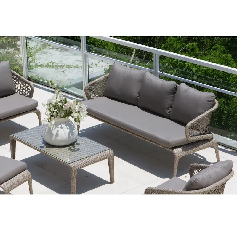 Нить из техноротанга - лучший материал для мебели, предназначенной для террас. Изделия из такого материала можно без опаски оставлять на солнце, под дождем, и даже зимой под снегом. В комплект поставки включены мягкие подушки из водоотталкивающей ткани, устойчивой к изнашиванию.