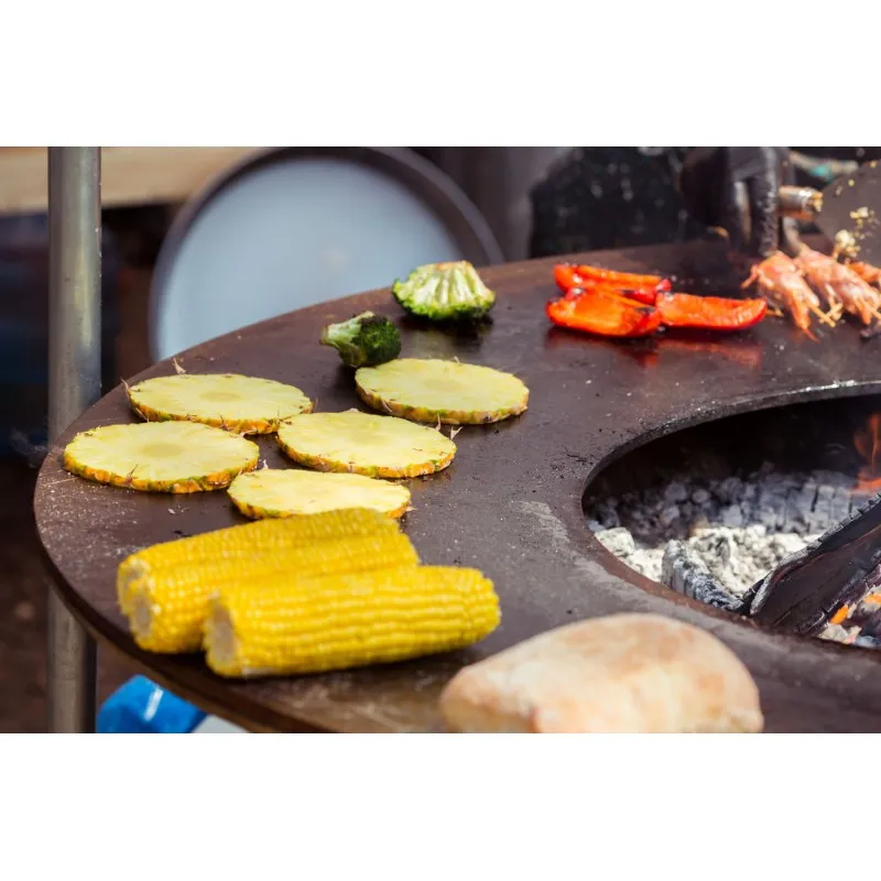 Вместо привычного мангала с углями и шампурами AHOS ORIGINAL предлагает сочетание открытого огня, раскаленной поверхности для жарки и решетки гриль для барбекю одновременно. Состоящий из трех частей: диска для приготовления еды из углеродистой стали, конусообразной чаши для огня и тумбы. Пламя горящее в чаше раскаляет жарочную поверхность очага до 250-300 градусов. Такая температура отлично подходит для приготовления барбекю. Большой стационарный гриль-мангал AHOS ORIGINAL отлично подходит для приготовления еды для большой компании.