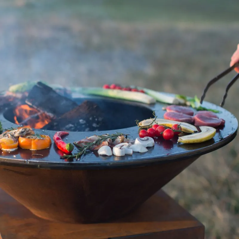 Вместо привычного мангала с углями и шампурами AHOS ORIGINAL предлагает сочетание открытого огня, раскаленной поверхности для жарки и решетки гриль для барбекю одновременно. Состоящий из трех частей: диска для приготовления еды из углеродистой стали, конусообразной чаши для огня и тумбы. Пламя горящее в чаше раскаляет жарочную поверхность очага до 250-300 градусов. Такая температура отлично подходит для приготовления барбекю. Большой стационарный гриль-мангал AHOS ORIGINAL отлично подходит для приготовления еды для большой компании.