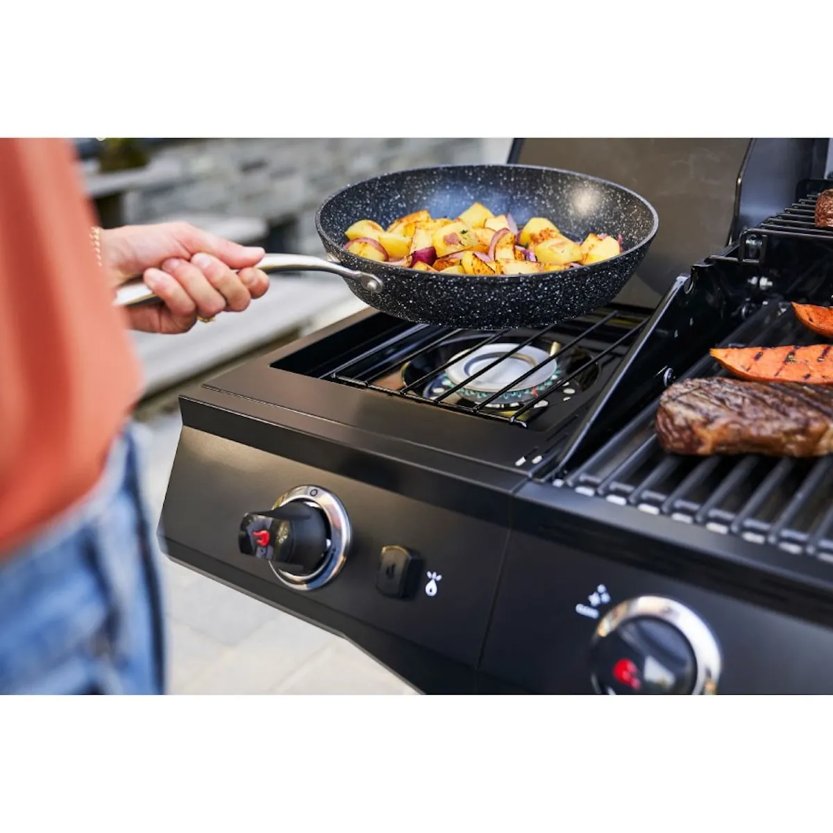 - Боковая горелка. Подогревайте соусы и гарниры, чтобы дополнить блюда, приготовленные на гриле, или опустите крышку и используйте поверхность в качестве дополнительного рабочего места.