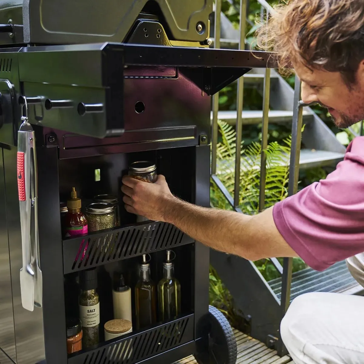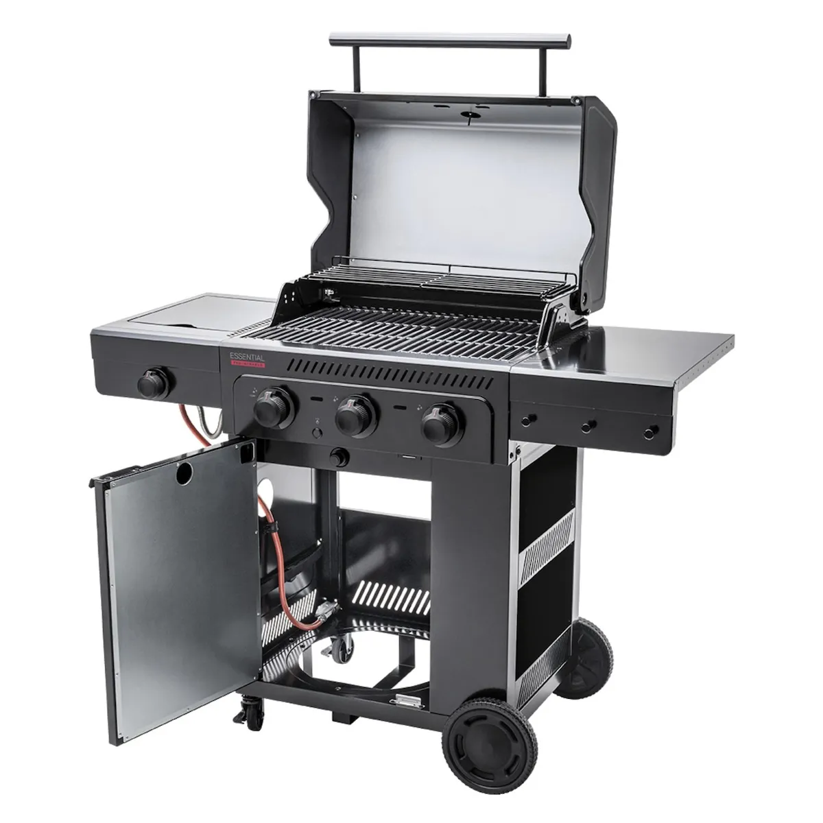 - Отсеки для хранения, шкаф и крючки: обеспечивают место для принадлежностей для гриля и газового баллона, поддерживая порядок в зоне гриля.