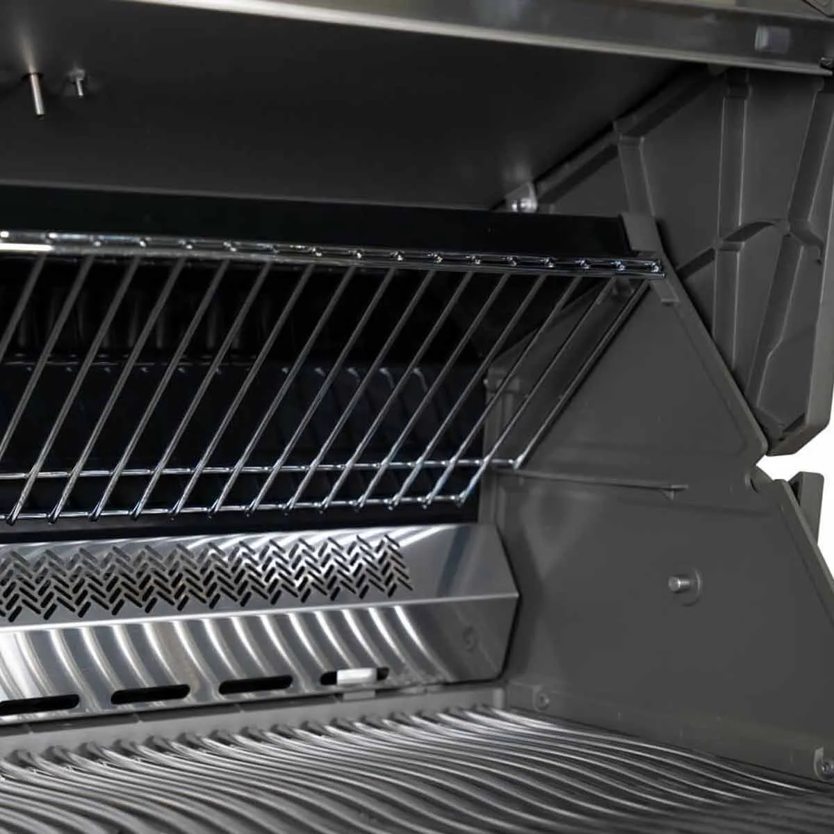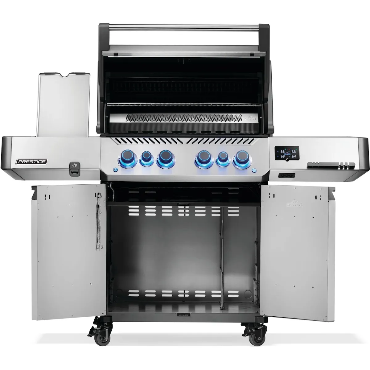 Napoleon Prestige также привлекает внимание: благодаря новому дизайну гриль выглядит минималистично и цельно. Боковые полки идеально совпадают с панелью управления, а удлиненная крышка гриля с прямой ручкой, наряду с дверцами с горизонтальными утопленными ручками, создают элегантный и лаконичный внешний вид.