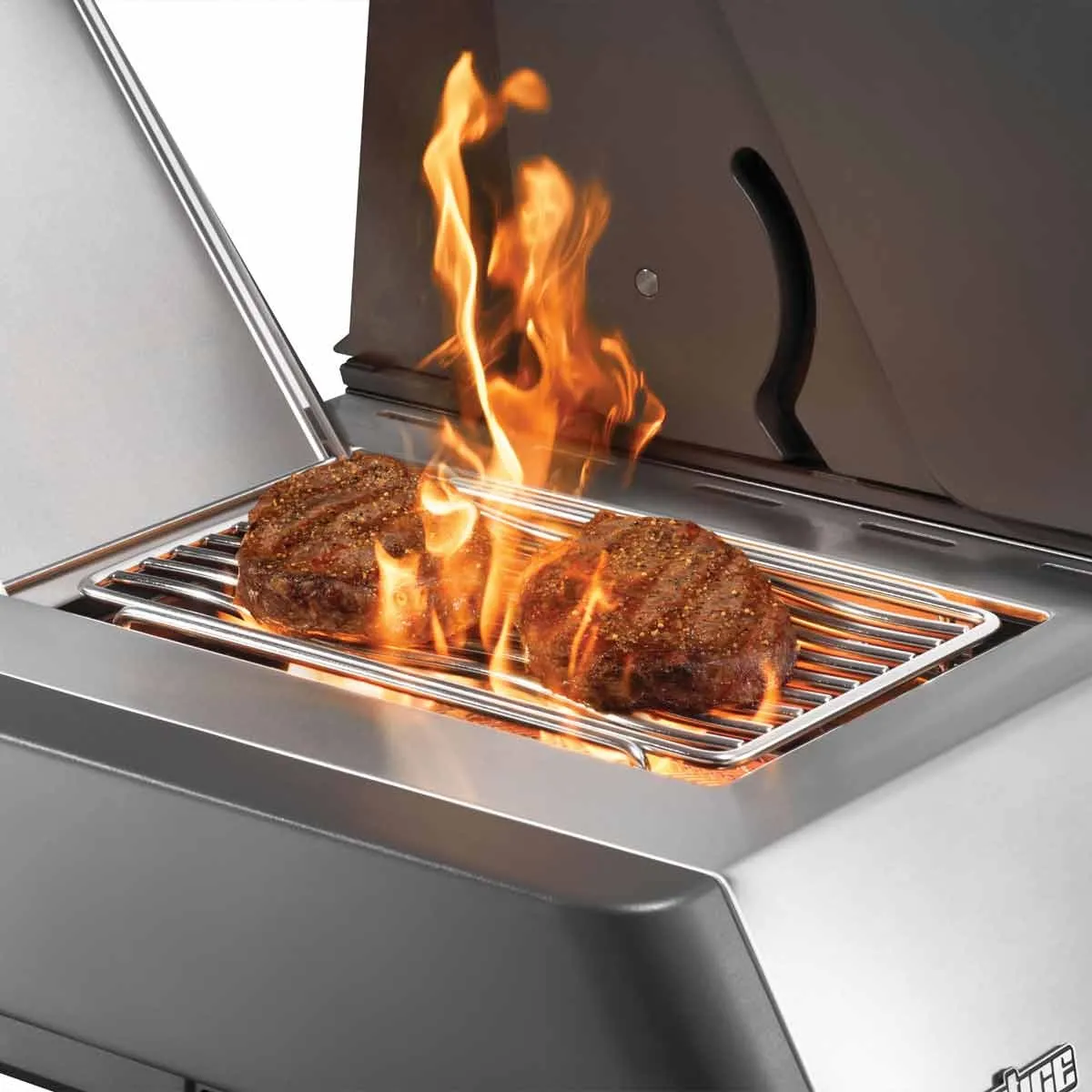 Инфракрасная боковая горелка SIZZLE ZONE. От 0 до 800 °C всего за 30 секунд! На большой инфракрасной горелке SIZZLE ZONE от Napoleon вы можете придать своим стейкам и бургерам восхитительную корочку и аппетитный запеченный аромат всего за несколько секунд. Незаменимая функция для всех любителей мяса: плавно регулируемая боковая горелка идеально подходит для приготовления хрустящих блюд в воке, а также гарниров и соусов. Зона SIZZLE в гриле Prestige 500 Connected оснащена регулируемой по высоте решеткой из нержавеющей стали, позволяющей готовить при любой температуре.