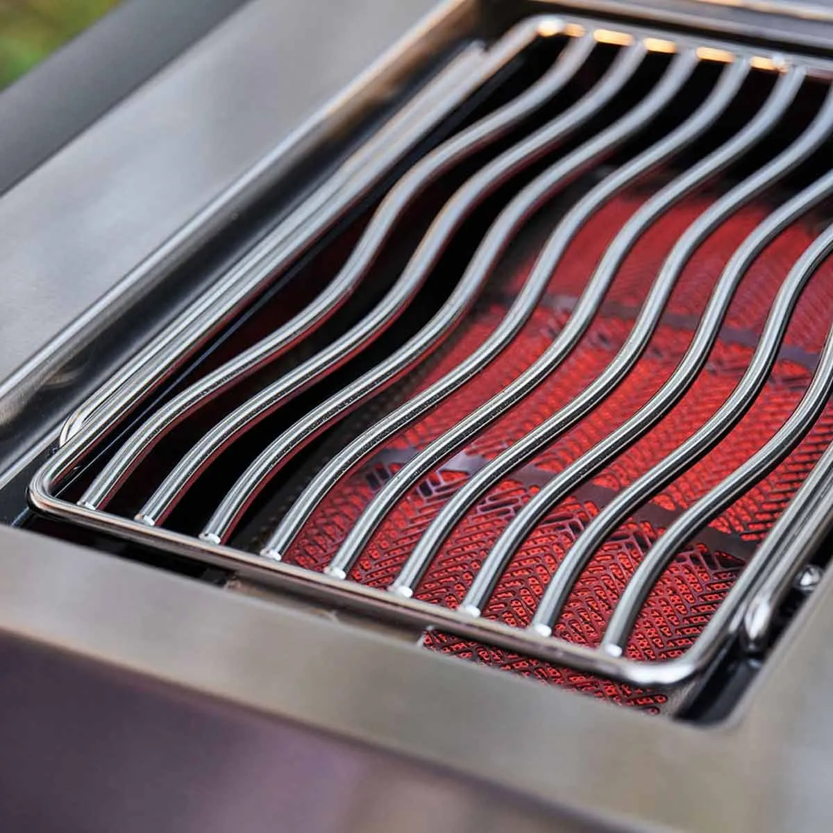 - большая инфракрасная SIZZLE ZONE (5 кВт) с регулируемой по высоте решеткой из нержавеющей стали, включая ветрозащиту и выдвижную крышку;