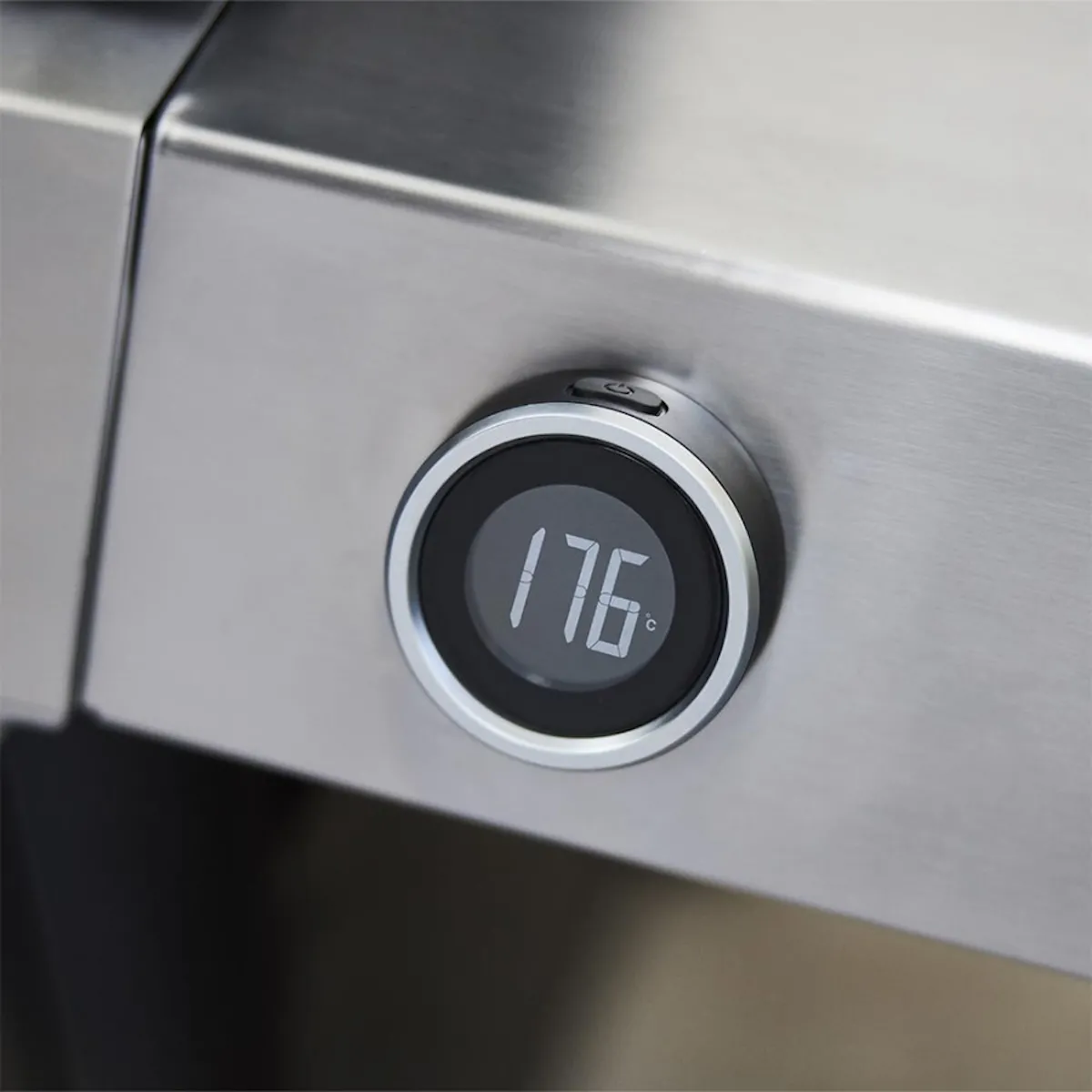 - Фарфорово-эмалированная крышка с цифровым термометром. Цифровой термометр, встроенный в боковую полку, позволяет точно контролировать температуру внутри гриля — без необходимости поднимать крышку и терять тепло.