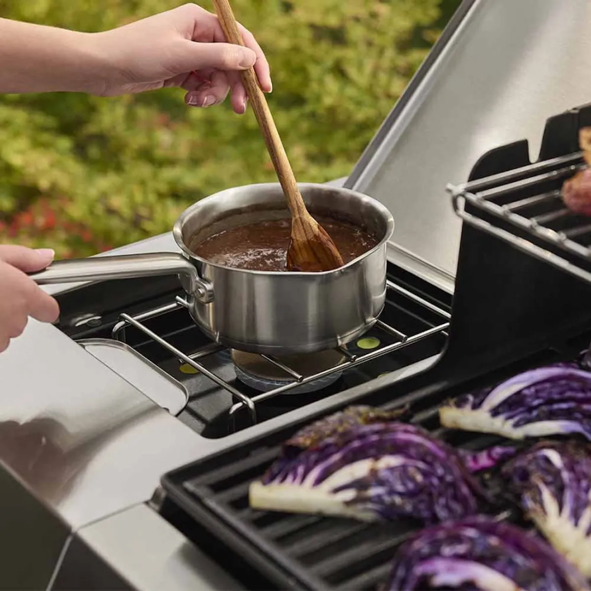 - Складная дополнительная решётка для приготовления. Идеальна для поджаривания булочек или поддержания тепла готовых блюд, освобождая основную зону для гриллинга.