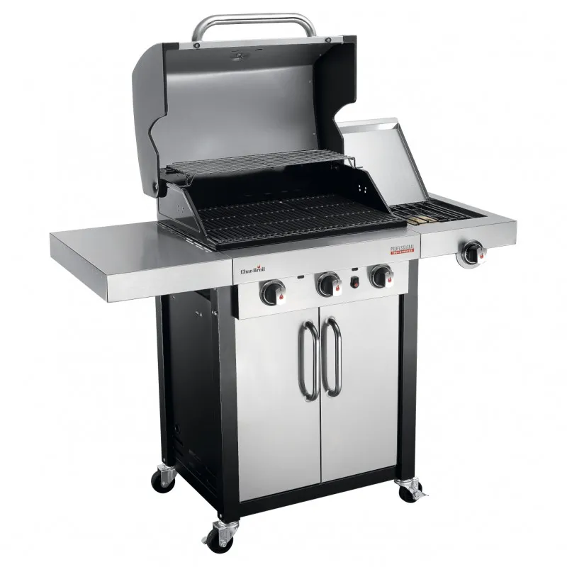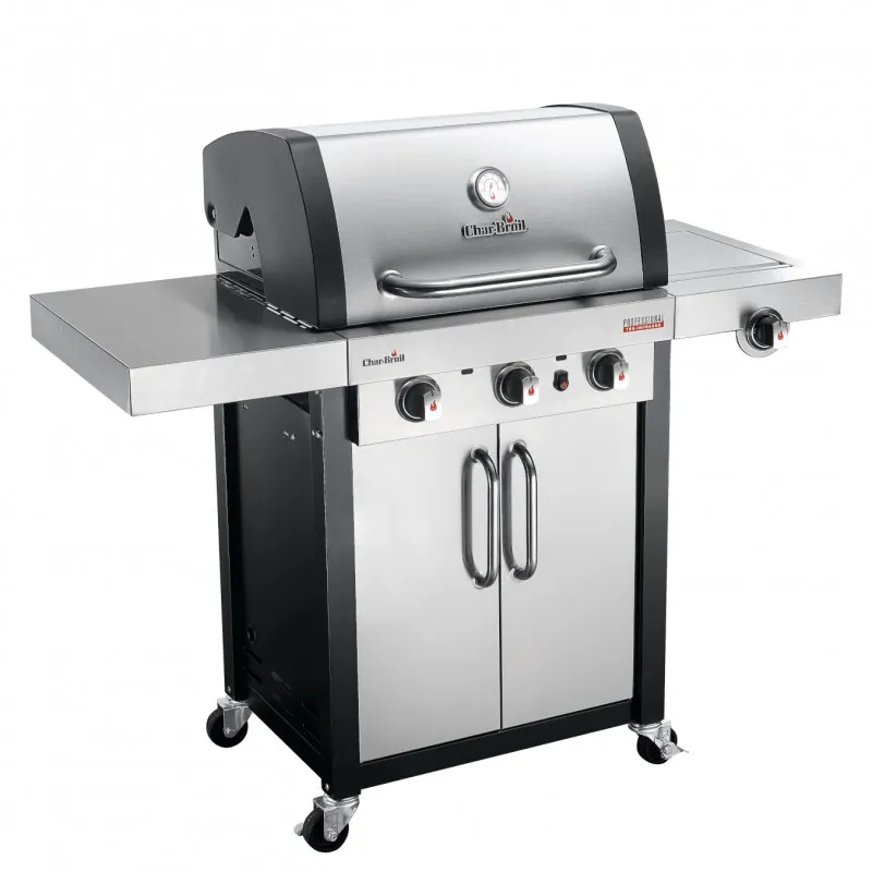 Газовый гриль Чар Броил Профешнл на три горелки. Профессиональный гриль на газу Char-Broil, модели Professional, имеет традиционное исполнение и может быть лучшим выбором для решения большей части задач, касающихся приготовления самых сложных блюд из разных продуктов. При этом, несмотря на то, что аппарат позиционируется, как модель для профессионального применения, Чар Бройл купить гриль можно и для использования на частной территории.