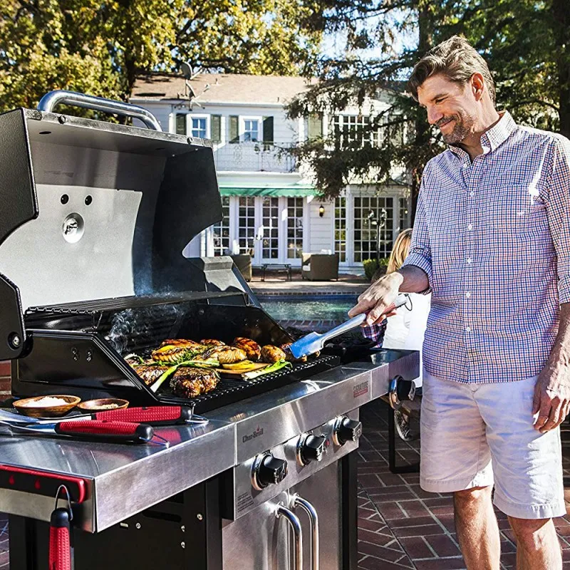 Char-Broil газовый гриль комплектуется чугунной решеткой, размером 60 на 43 сантиметра. Для легкого и удобного перемещения аппарата, предусмотрены 4 колеса. Основные достоинства. Одним из основных достоинств, в том числе, ради которого стоит Чар Бройл барбекю газовый купить, можно считать достаточно эффективную систему рассеивания тепла TRU-Infrared, чье функционирование обеспечивает металлическая пластина особой формы, размещаемая под рабочей решеткой. Нагреваемая горелками, она способствует равномерному распределению тепла.