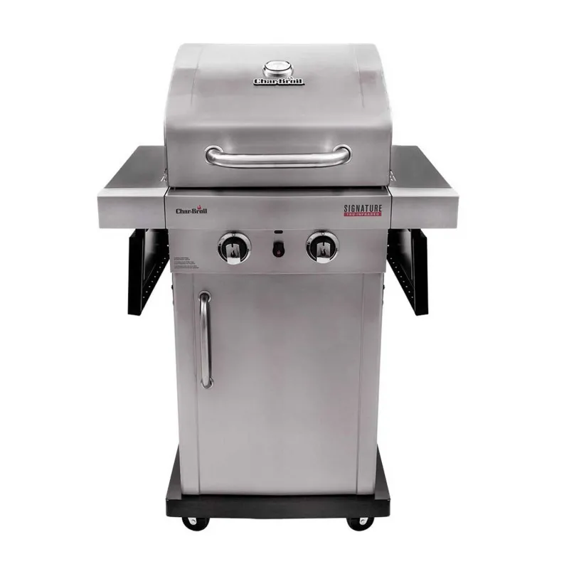 Газовый гриль на две горелки Чар Броил Сигнейче. Инфракрасный Char-Broil газовый барбекю, модели Signature, выделяется, не только впечатляющей функциональностью, но и весьма привлекательным дизайном, определяемым встроенными светодиодными индикаторами ручек, а также глянцем и лакированным фарфором поверхностей отдельных элементов аппарата.