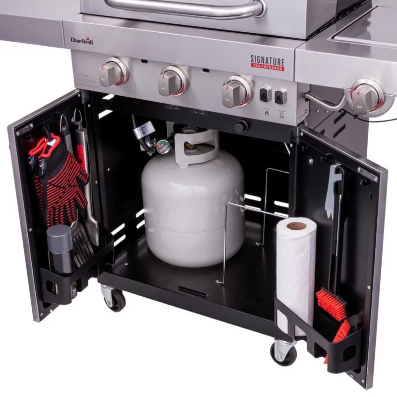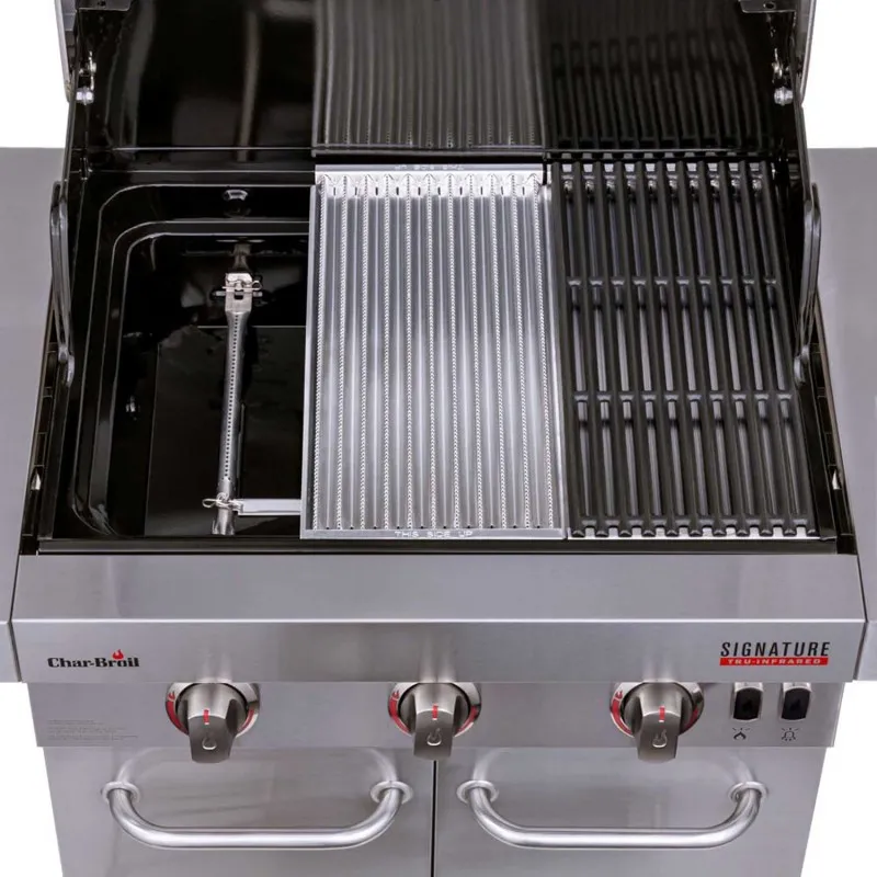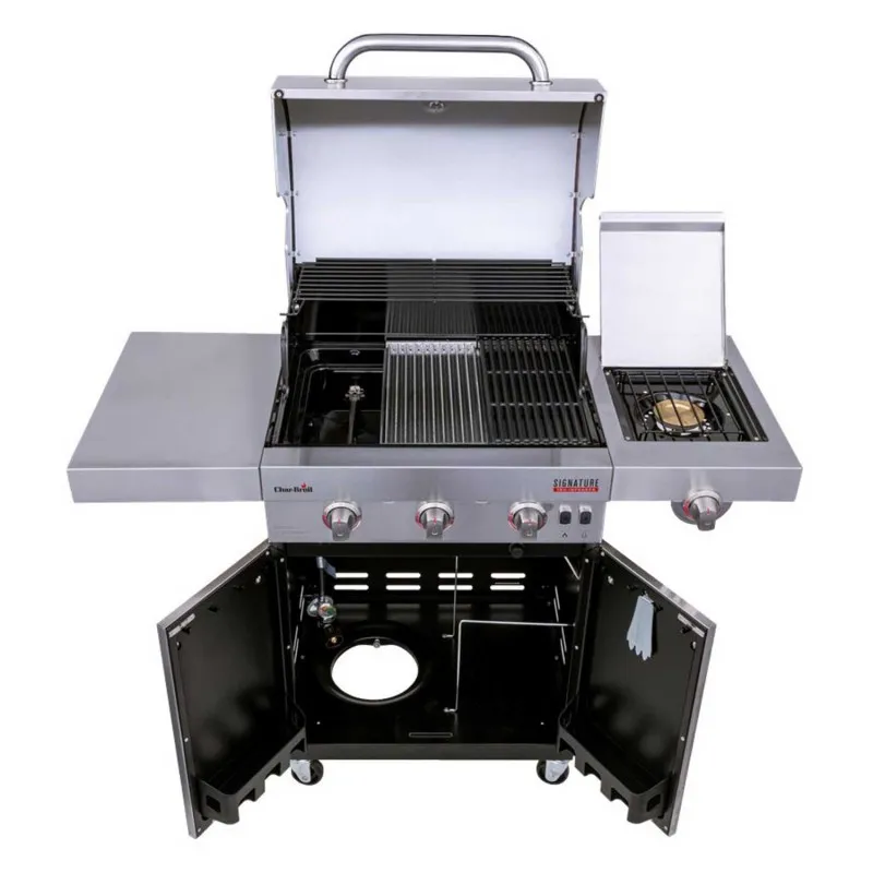 Инфракрасный газовый гриль Char-Broil Signature 3 Burner предотвращает вспышки жира, обеспечивает равномерный нагрев и готовит сочные блюда для максимальной производительности и универсальности приготовления. Технология приготовления TRU-Infrared предотвращает вспышки жира, обеспечивает равномерный нагрев и готовит на 50% сочную пищу. Встроенные светодиодные индикаторы ручек и глянцевый дизайн крышки, ручек и шкафа для отличительного стиля. Электронное зажигание SureFire для быстрого и надежного запуска одним нажатием кнопки. Чугунные решетки с фарфоровым покрытием прочные, устойчивые к ржавчине и легко моются. Боковая полка обеспечивает дополнительное рабочее место. Дополнительная боковая горелка для готовки с помощью гриль посуды.