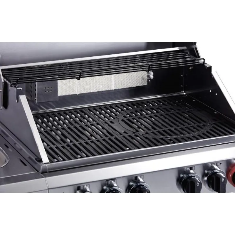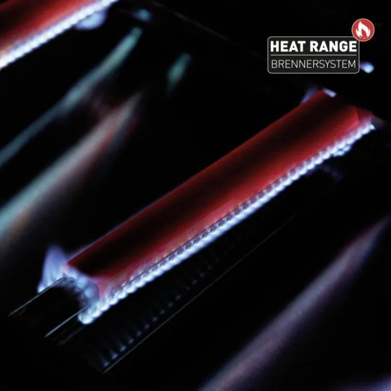 - 4 мощные инновационные горелки HEAT RANGE® (3 х 3,7 кВт + 1 х 4,2 кВт), боковая конфорка (3,5 кВт), горелка для вертела (4,0 кВт);