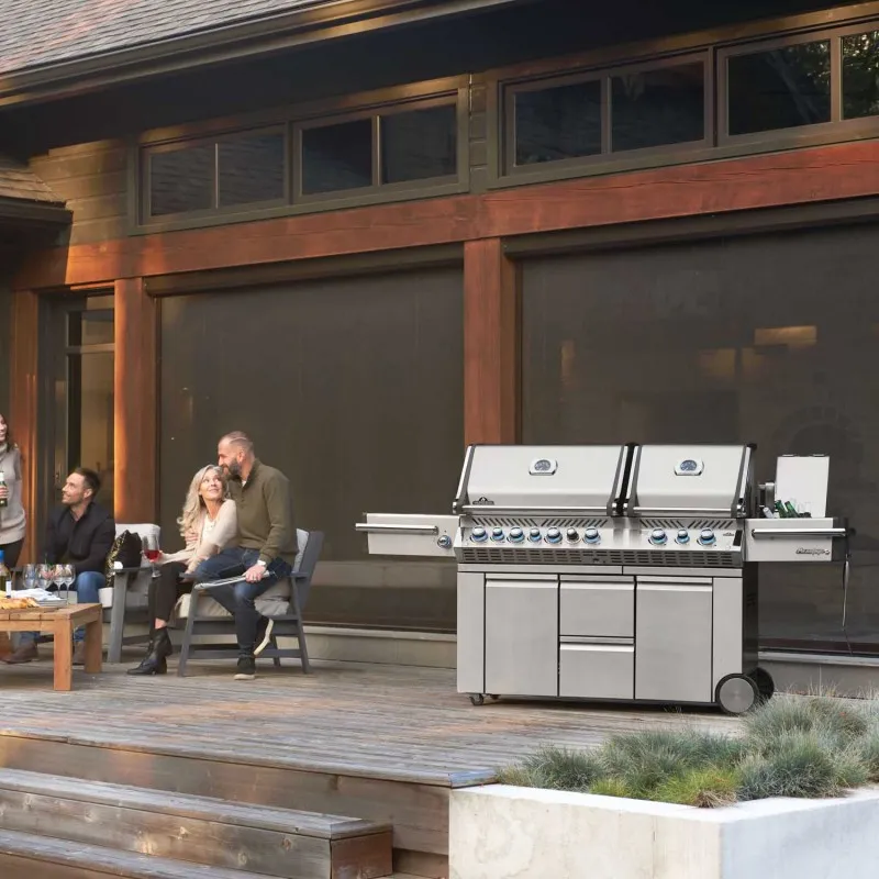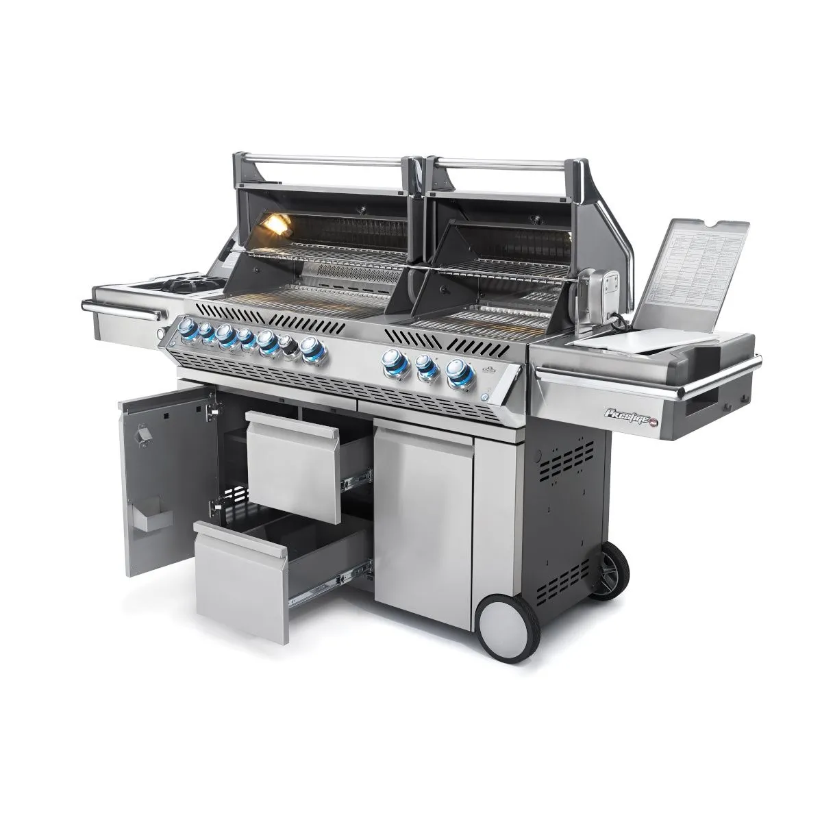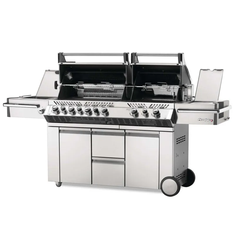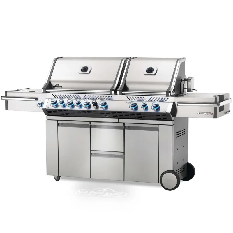 Двухкамерный газовый гриль NAPOLEON Prestige PRO 825 с боковой горелкой с электроприводом, инфракрасной задней и нижней горелками легко доказывает, что «две головы всегда лучше, чем одна». Внешний блестящий корпус из нержавеющей стали обеспечивает устойчивость к внешнему воздействию, а хромированные детали добавляют роскоши.