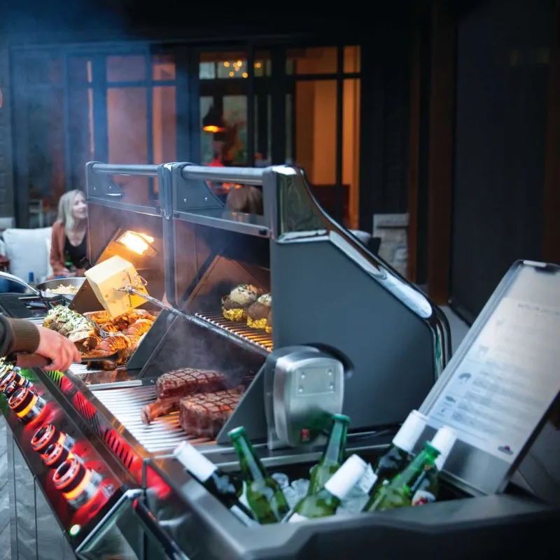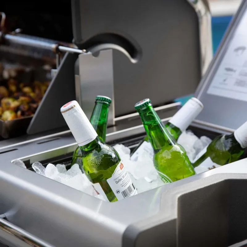 - боковые пристолья из нержавеющей стали с поручнями для полотенец, интегрированной емкостью для льда с разделочной доской и крюками для кухонных принадлежностей;