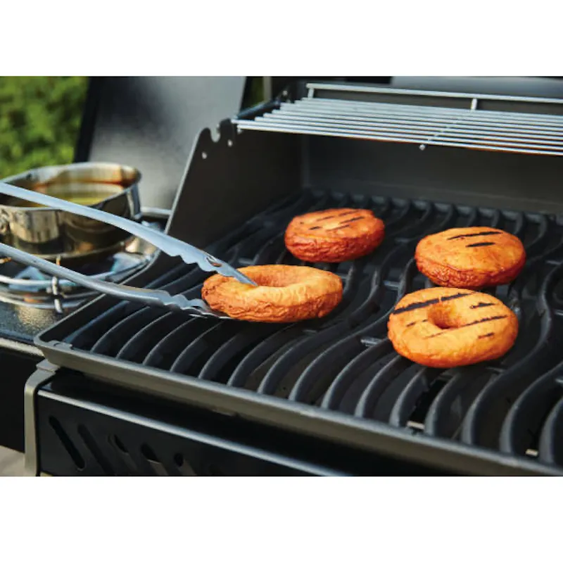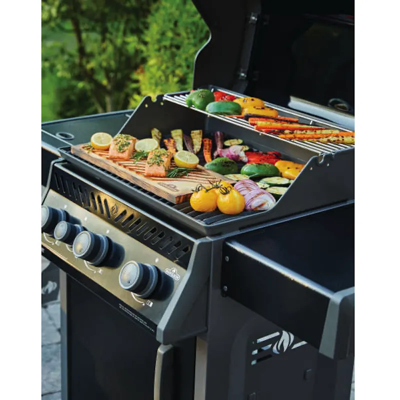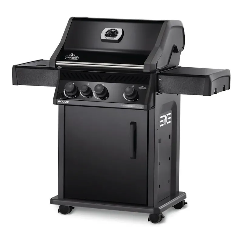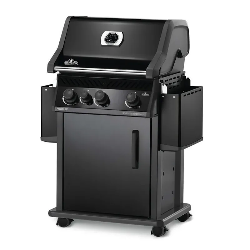 Газовый гриль Napoleon Rogue 425 SB в черном цвете привлекает любителей грилевания оптимальным размером, простой и надежной конструкцией и высоким качеством материалов. Газовый гриль Napoleon Rogue 425 SB – это прекрасное дополнение для Вашего загородного дома или дачи. Корпус гриля изготовлен из высококачественной стали, покрыт прочной черной эмалью, а очаг гриля - из литого алюминия. Чугунные двухсторонние барбекю-решетки волнистой формы WAVE™ создают основную жарочную поверхность площадью 2700 см² и дополняются хромированной решеткой для подогрева и традиционной конфоркой на левом боковом столике. Уникальная система распределения тепла (каскадное размещение защитных пластин) исключает холодные зоны на жарочной поверхности. Система быстрого поджига JETFIRE™ легко вводит гриль в эксплуатацию. Для удобного контроля температуры крышка оборудована термометром ACCU-PROBE™. Боковые столики оснащены крючками для подвешивания аксессуаров, оба столика при необходимости складываются. В тумбе гриля предусмотрен отсек для газового баллона. Гриль легко передвигается и фиксируется на месте благодаря всепогодным колесам EASY ROLL™ со стопорами.
