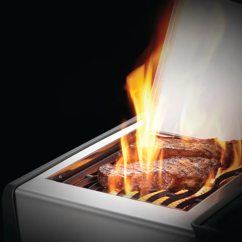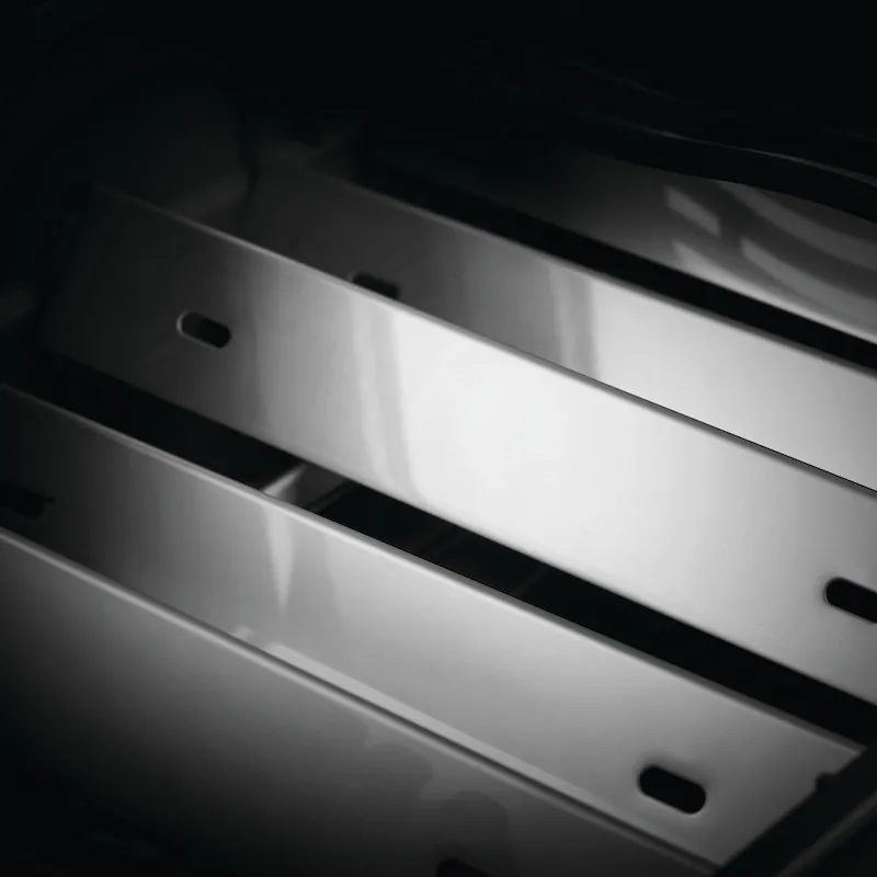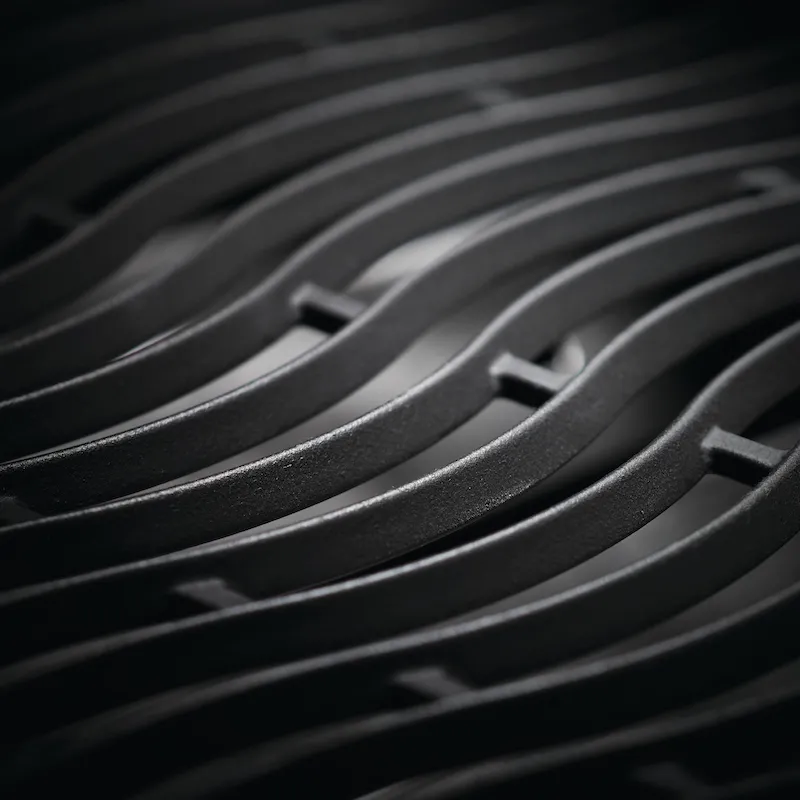 Три основных конфорки имеют двухуровневые пластины для равномерного жара, которые испаряют капли и возвращают вкус пище. Они также защищают конфорки и предотвращают возгорание жира. Чугунные решетки добавляют характерные волнообразные следы WAVE на все, что готовится на гриле, а покрытие из фарфоровой эмали предотвращает прилипание продуктов и упрощает их чистку.