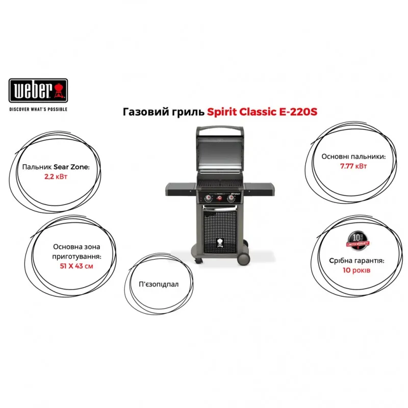 Гриль на газе Weber Spirit Classic E-220S - это тот газовый гриль, цены на который полностью оправданы отличным качеством сборки и полноценной функциональностью. При этом сам производитель предоставляет гарантию на свою продукцию сроком до 10 лет, а это довольно внушительный показатель. Именно это газовое барбекю купить стоит еще и потому, что все его элементы выполнены из высокопрочных материалов.