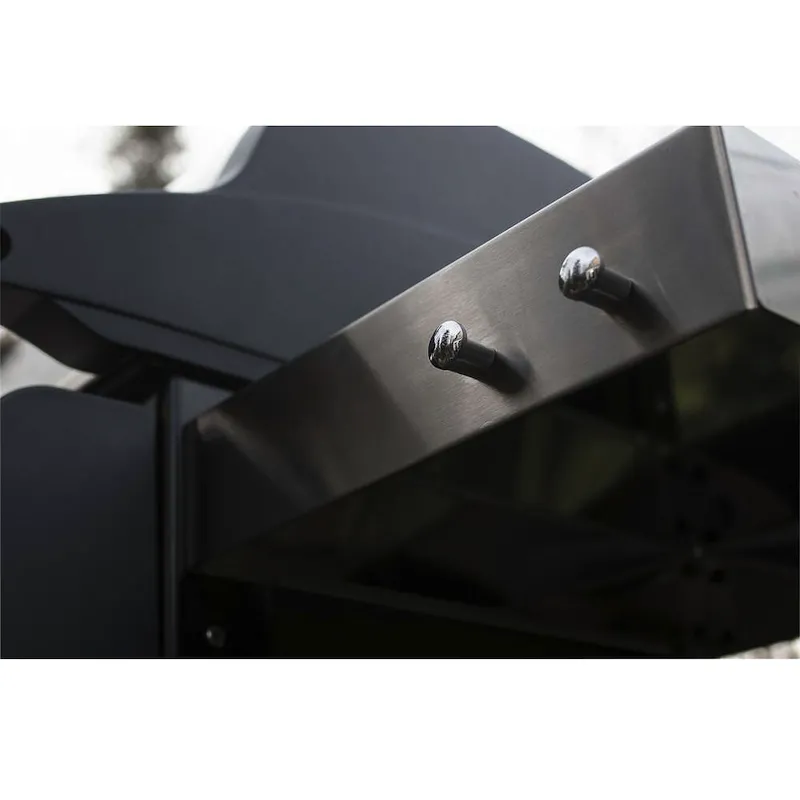 Отличительная особенность - стильная дверца, закрывающая переднюю часть тележки, в которой обычно устанавливается переносной газовый баллон. Три горелки из нержавеющей стали, которые обрамляются Flavorizer Bars (V-образными стальными пластинами из нержавейки) вблизи основных решеток, превращают этот барбекю в идеальный гриль.