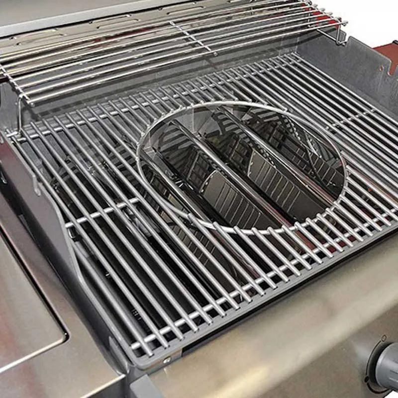 - чугунная решетка покрытая фарфоровой эмалью, прослужит долго, и благодаря съемному центральному модулю, позволит использовать на гриле камень для пиццы, ростер для курицы, специальную решетку для стейков, чугунный вок и чугунную сковороду (приобретаемые отдельно);