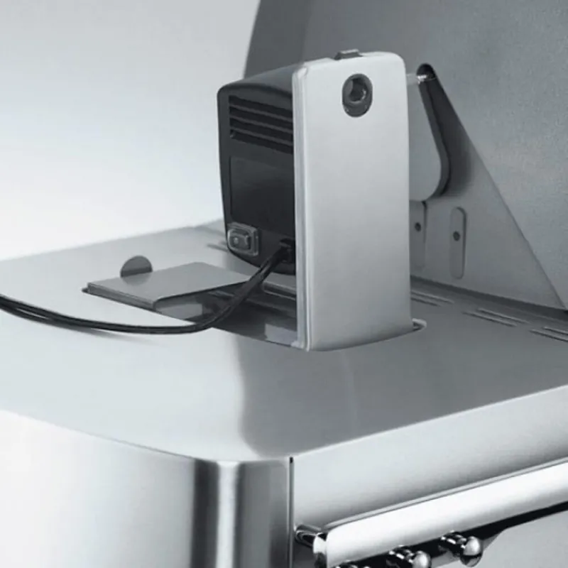 Таким образом вы всегда можете контролировать температуру без необходимости постоянно поднимать крышку. Хромированная ручка также служит опорой для двух лампочек для гриля, которые помогают при ночном приготовлении на гриле, отлично освещая рабочую поверхность.