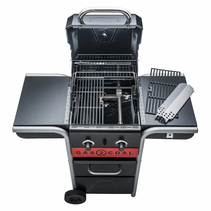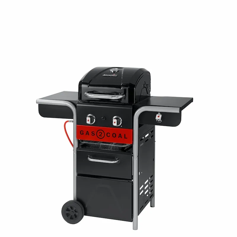 Какой гриль выбрать, газовый или угольный? Революционный газово-угольный гибридный гриль. Если Вам сложно определиться с типом топлива, обратите внимание на гибридный газо-угольный гриль Char-Broil Gas2Coal. C мультитопливным грилем Char-Broil Hybrid Gas2Coal 210 не нужно выбирать. В качестве источника тепла здесь можно использовать как газ так и уголь. На первый взгляд, это полноценный газовый гриль на 2 горелки. Но стоит только заменить защитные пластины газовых горелок на специальный поддон для угля — и Ваш гриль уже угольный! И это еще не все: газовые горелки с электронным зажиганием SureFire разожгут Ваш уголь до рабочей температуры менее чем за 60 секунд.