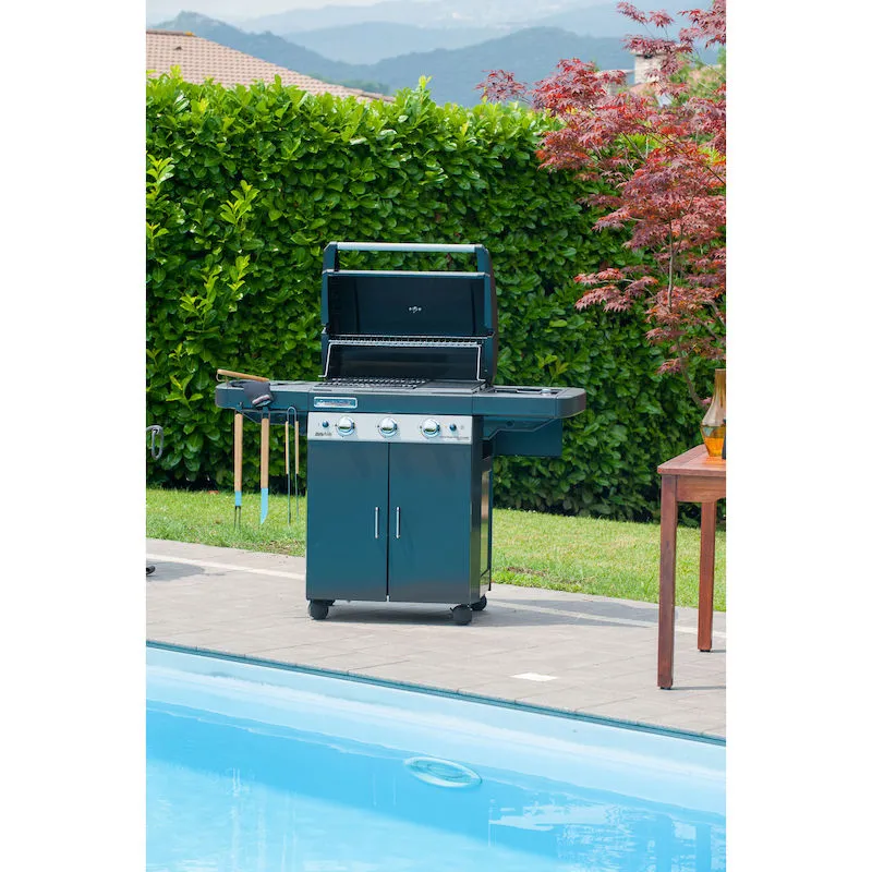 Campingaz гриль на газе имеет впечатляющую площадь рабочей варочной поверхности: 3 трубчатые горелки из нержавеющей стали и 2800 см2 пространства позволяют готовить одновременно для 12 человек. К прочим особенностям относят наличие эмалированной чугунной варочной поверхности, кулинарную модульную систему, пьезорозжиг, складные полки, литую крышку из стали и алюминия.
