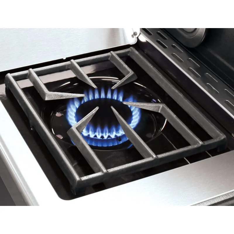 Боковая конфорка промышленного класса с тяжелой чугунной решеткой дает вам дополнительные возможности для приготовления аппетитных соусов или супов во время приготовления на гриле. Горелка для вертела из нержавеющей стали мощностью 4,4 кВт в комплекте с вертелом и двигателем обеспечивает равномерное нагревание.