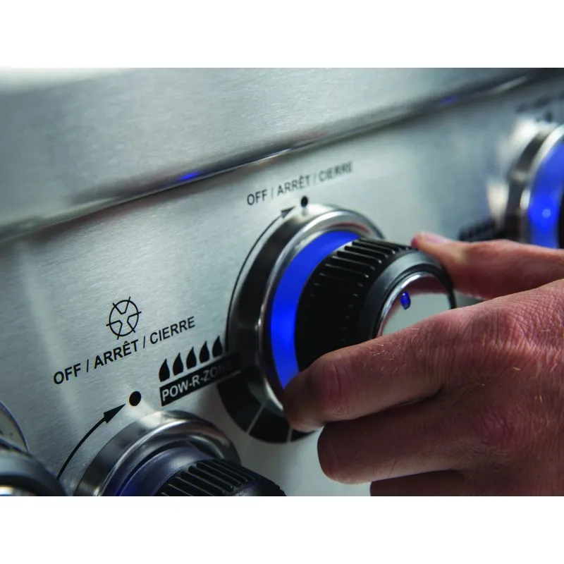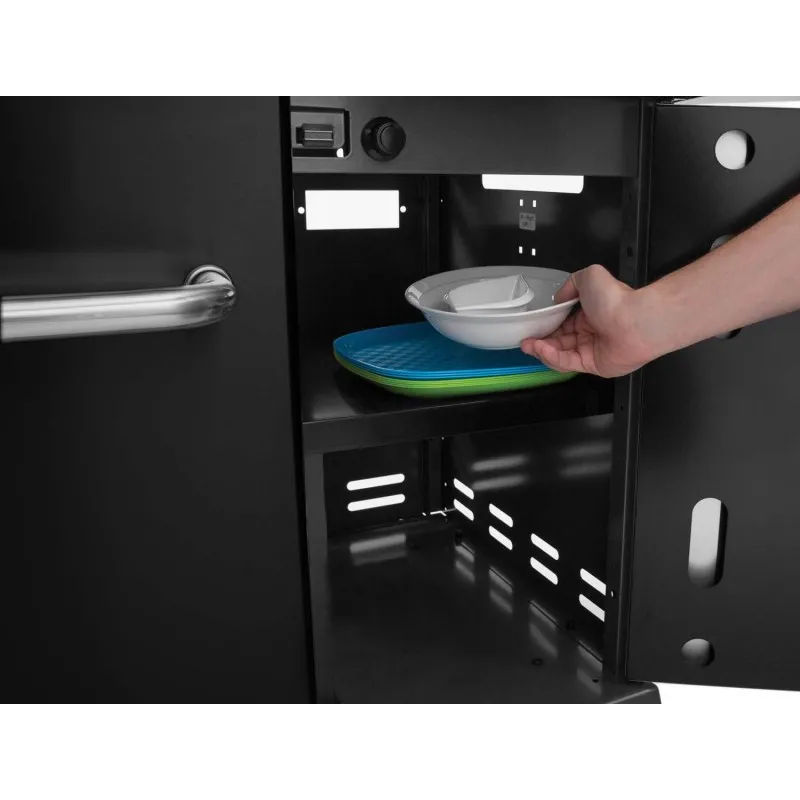 В большом закрытом шкафу есть место для хранения газовых баллонов, а на боковых полках из нержавеющей стали есть контейнеры для приправ и крючки для инструментов. Каждая горелка независимо управляется с помощью простых в использовании ручек управления и электронного зажигания, установленных на лицевой панели из нержавеющей стали.