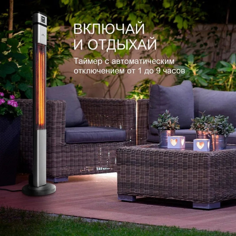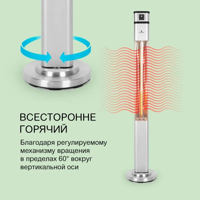 - Согревает все вокруг: благодаря встроенному вращателю по вертикальной оси на 60 °