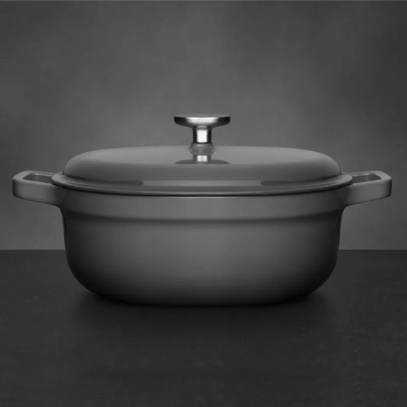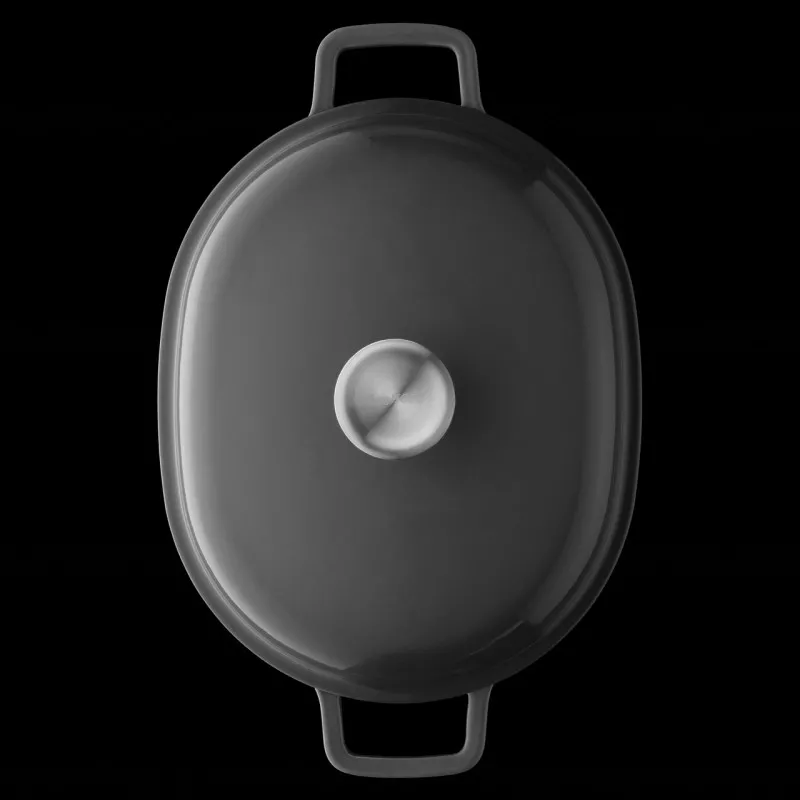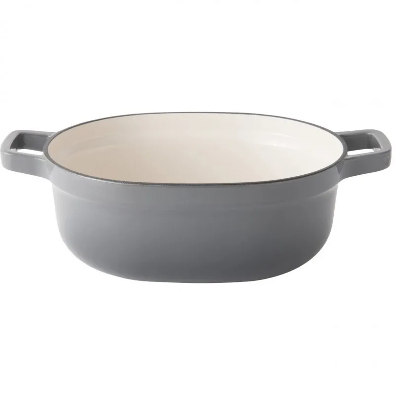 Кастрюля овальная Berghoff GEM с антипригарным покрытием, 35х22 см см., 4,1 л. Кастрюля изготовлена из чугуна. Внутри покрыта эмалью кремового цвета. Снаружи - глянцевая эмаль серого цвета. Крышка изготовлена из чугуна, покрыта глянцевой эмалью серого цвета. Благодаря толстым стенкам, которые аккумулируют и долго сохраняют тепло, кастрюля идеально подходит для приготовления рагу или жаркое. Кастрюлю можно использовать в гриле, в духовке и на плите. При использовании в гриле температура не должна превышать 250 градусов. Рекомендуется ручная мойка.