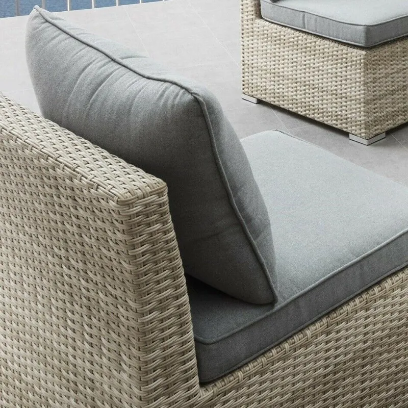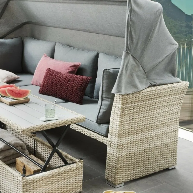 Удобный комплект для отдыха со столом-трансформером из искусственного ротанга приятного бежевого цвета, с подушками светло-серого цвета. Высота подушек для сидения - 10 см., спинки - 18 см.