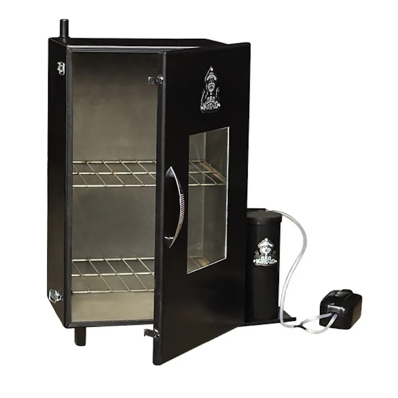 Шкаф не займет много места на территории. Он выглядит аккуратно и презентабельно. Его размеры составляют всего 66 х 38 х 31 при весе 20 кг. Конструкция коптильни сборно-разборная. В комплект входят дымогенератор с габаритами 35 х 9 см и толщиной стенок 3 мм, конденсатосборник и компрессор, работающий от сети 220 V. Конденсатосборник значительно уменьшает попадание тяжелых смол внутрь коптильни.