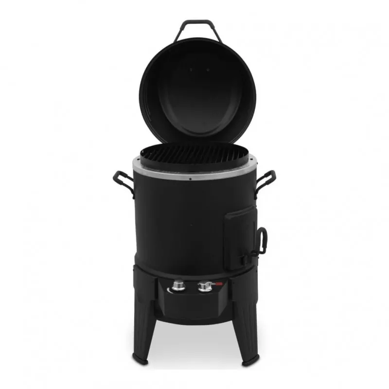 Ещё один немаловажный момент: для создания кулинарного шедевра вам не понадобится масло. То есть приготовление блюда получается экономным и безопасным, а сама еда сохраняет свои первозданные свойства. Сверху, под откидной крышкой, имеется съёмная решётка, диаметр которой составляет 39 см. То есть заказать газовую коптильню стоит, чтобы подпекать, например, овощи, рыбу, грибы, получать идеальные сочные стейки.