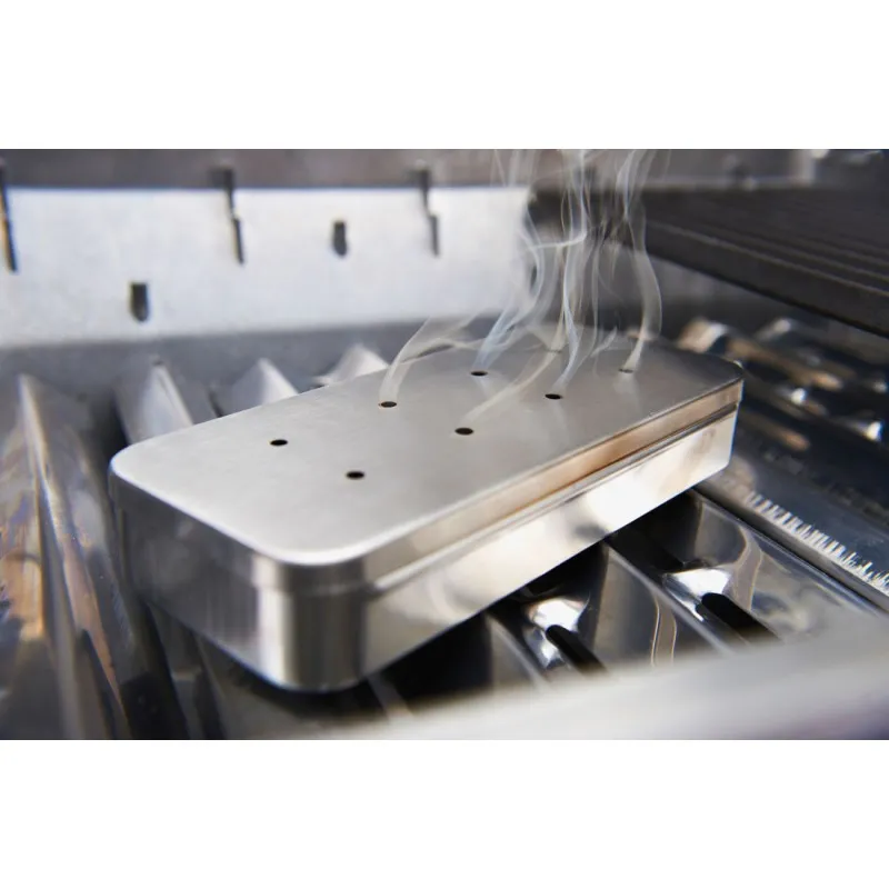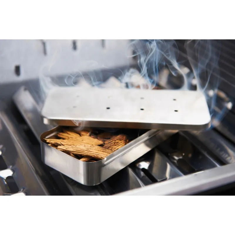 Для копчения на газовых и угольных барбекю. Придает мясу аромат и вкус дыма. Может использоваться с древесной стружкой или специальными гранулами. Материал: нержавеющая сталь.