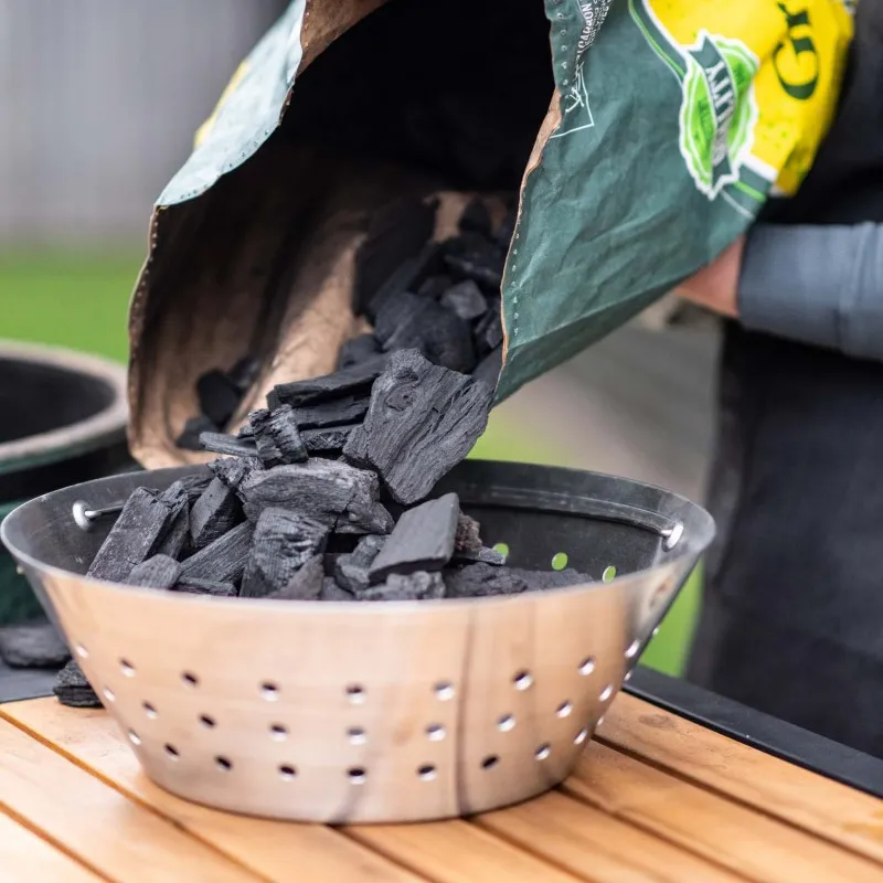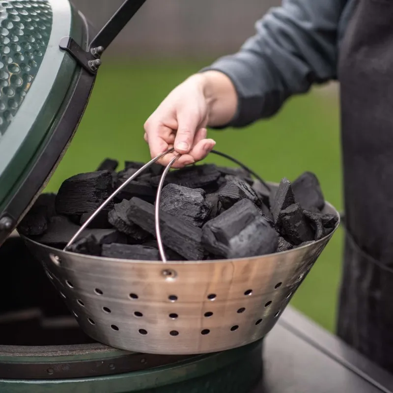 Корзина для угля Big Green Egg предназначена для легкого и быстрого розжига, а также извлечения угля из гриля. Просто поднимите корзину за удобные ручки и вытряхните золу в мусорное ведро. Корзина вставляется в гриль вместо чугунного колосника.