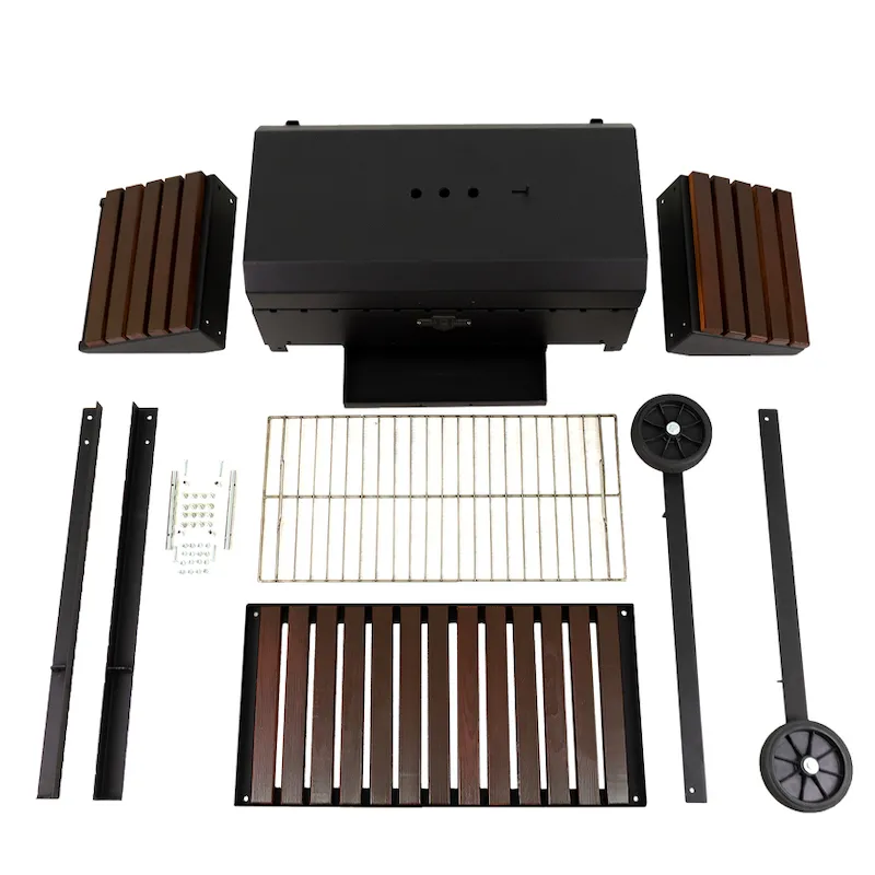 - комплектация: мангал, крышка, полка для инвентаря, зольник, боковые полки, колеса для транспортировки, решетка с пищевой нержавейки;