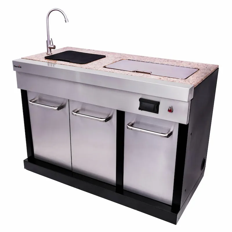 Многофункциональный модуль Char-Broil® поможет превратить уличную кухню Medallion Series™ в идеальное пространство для отдыха. Этот универсальный по дизайну модуль можно легко установить в открытую кухню так, как вы сами пожелаете. Он оборудован смесителем с раковиной, легко снимаемым изолированным кулером, доской для нарезки, которая устанавливается на раковину, а также мусорным ведром и розеткой. Изготовленный из высококачественной нержавеющей стали и гранитной столешницы, модуль Char-Broil® прочен и универсален. К встроенной розетке можно подключать кухонные приборы или например заряжать телефон. Контейнер для мусора всегда под рукой, поэтому все пространство легко держать в чистоте.
