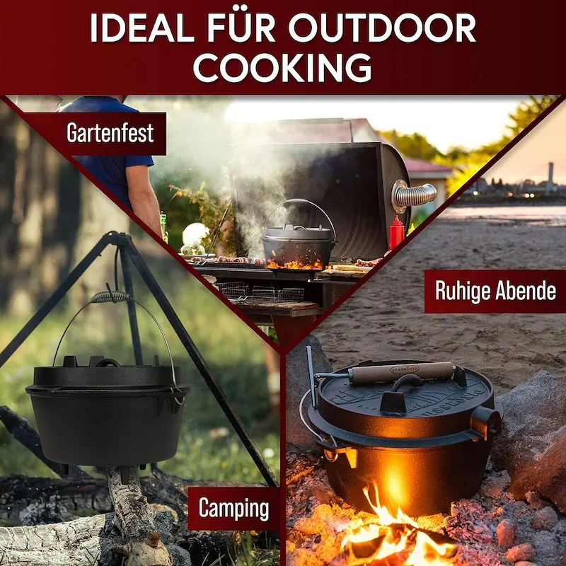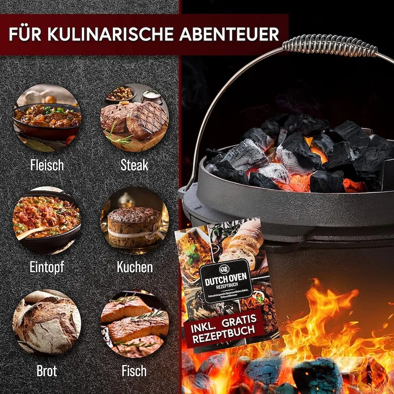 Чугунная голландская печь Gusskönig объемом 7 литров с ножками - это многофункциональная посуда, которая станет незаменимым помощником для приготовления блюд на открытом огне и дома. Благодаря ножкам печь идеально подходит для установки на углях или решетке, обеспечивая равномерное распределение тепла для достижения идеального вкуса и текстуры блюд. В комплекте идет крышка, которая также может использоваться как сковорода, позволяя запекать или жарить ингредиенты отдельно. Инновационный подъемник крышки 2-в-1 позволяет легко поднимать крышку или использовать ее как сковороду. Это делает приготовление удобным и функциональным, без подгорания.