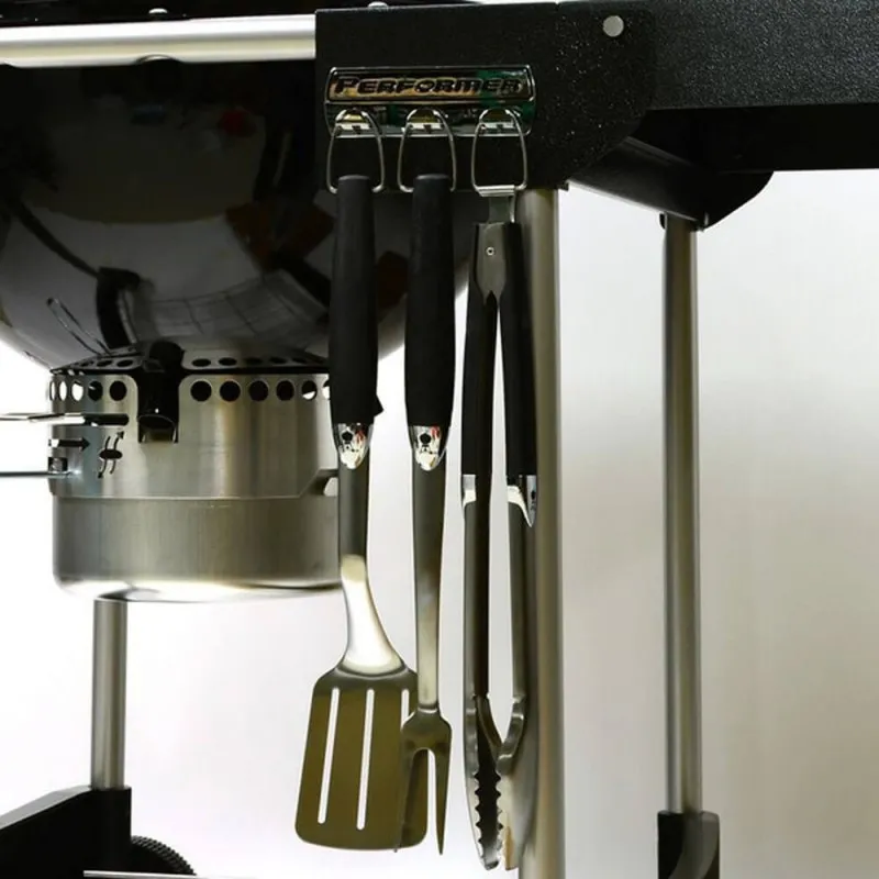 Лопатка, щипцы и вилка сделаны из нержавеющей стали с пластиковыми ручками. Благодаря наличию колец на ручках, приборы удобно вешать на боковых столиках и на держатель для приборов. Набор инструментов для гриля Weber из трех предметов содержит все необходимое для любителя барбекю. В него входят лопатка, щипцы и вилка — то, что нужно для приготовления большинства блюд. Длина инструментов достаточна для использования на угольных, газовых или электрических грилях любых размеров. Все инструменты изготовлены из высококачественной нержавеющий стали, а ручки покрыты мягким, нескользящим материалом. После использования все инструменты можно мыть в посудомоечной машине.